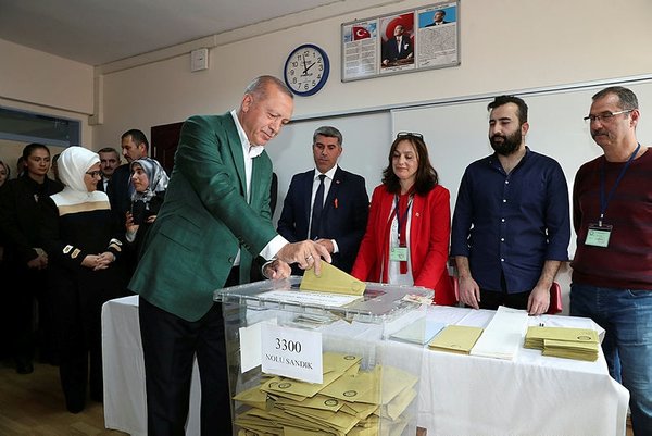 President Recep Tayyip Erdoğan cast his ballot in Saffet Çebi Elementary School in Üsküdar district located in Istanbul's Asian side. First Lady Emine Erdoğan, Finance Minister Berat Albayrak and his wife Esra Albayrak accompanied Erdoğan at the polling station.