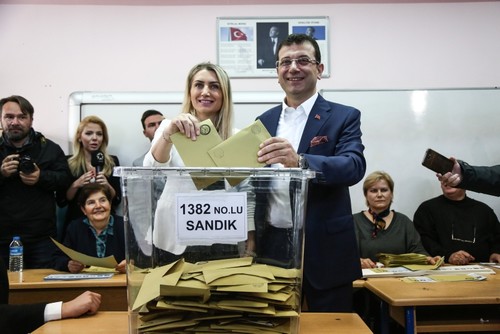 Main opposition Republican People's Party's (CHP) Istanbul mayoral candidate Ekrem Imamoğlu cast his ballot in Beylikdüzü district on the European side. His wife Dilek Imamoğlu accompanied him at the ballot box.