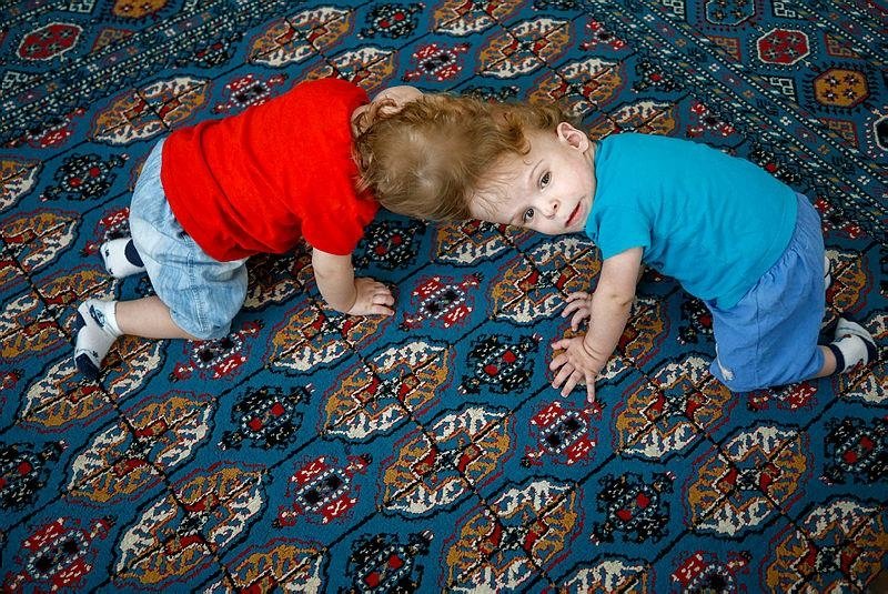 Conjoined to each other from the top of their heads, the brothers are unable to crawl without hurting each other, nor face the same direction at the same time.