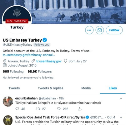 The official Twitter account of the embassy liked a message by Ergün Babahan, one of the senior figures of the Gülenist Terror Group (FETÖ) who fled Turkey following the July 15 coup attempt.