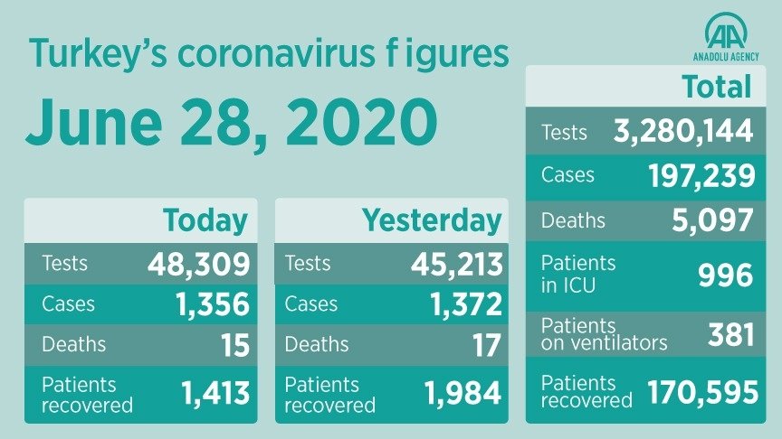 A total of 1,413 people beat COVID-19 in the past day, raising the overall count to 170,595, Fahrettin Koca said on Twitter, citing the Health Ministry data.