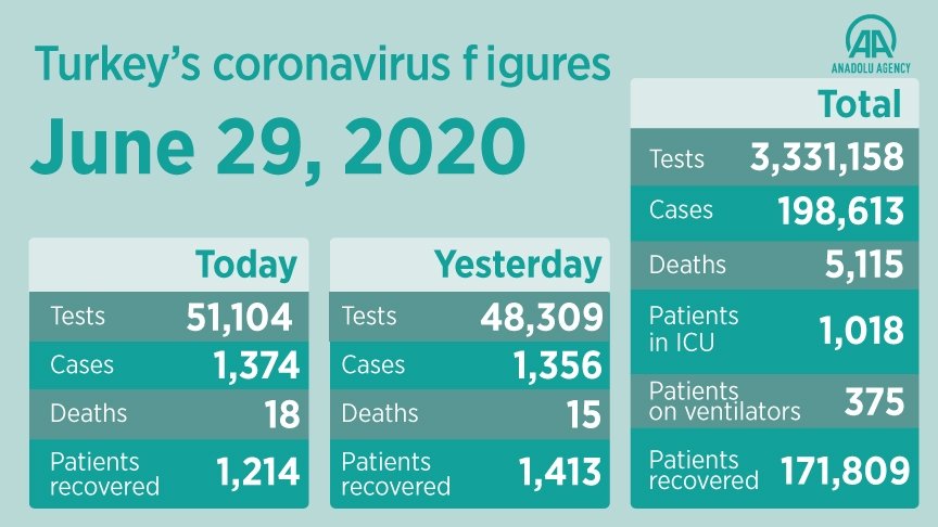Turkey registered 1,374 new cases of COVID-19 in the past day, and the total number of infections nationwide reached 198,613, showed the ministry data.