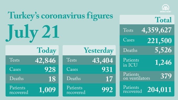 The last 24 hours in Turkey saw 928 new cases of the novel coronavirus, bringing the tally to 221,500, said Fahrettin Koca on Twitter.