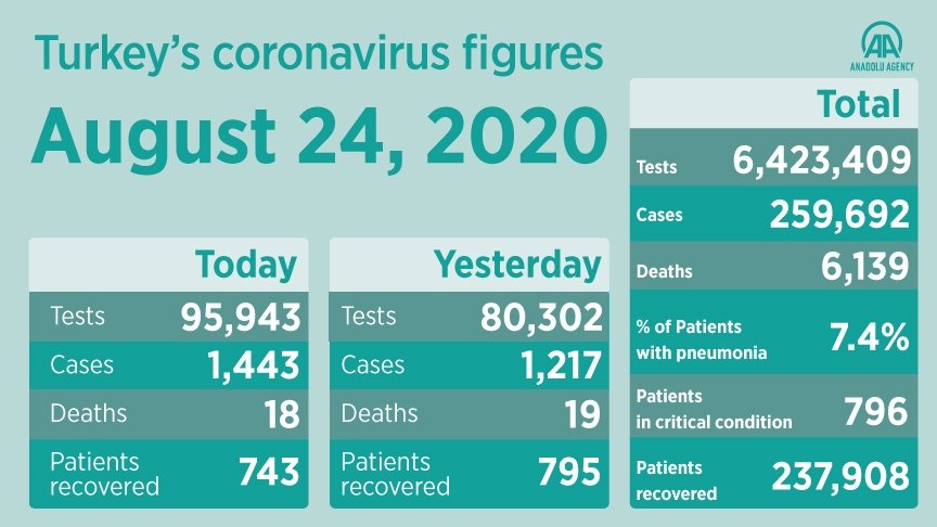 On Twitter, Health Minister Fahrettin Koca said 743 patients recovered from COVID-19 over the past day, pushing the total number of recoveries to 237,908.
