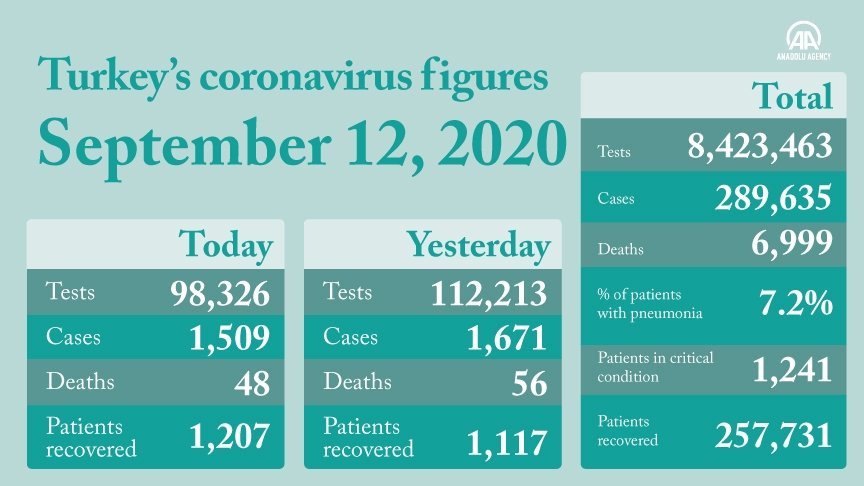 Turkey reported 1,509 more coronavirus cases and 1,207 recoveries on Saturday.