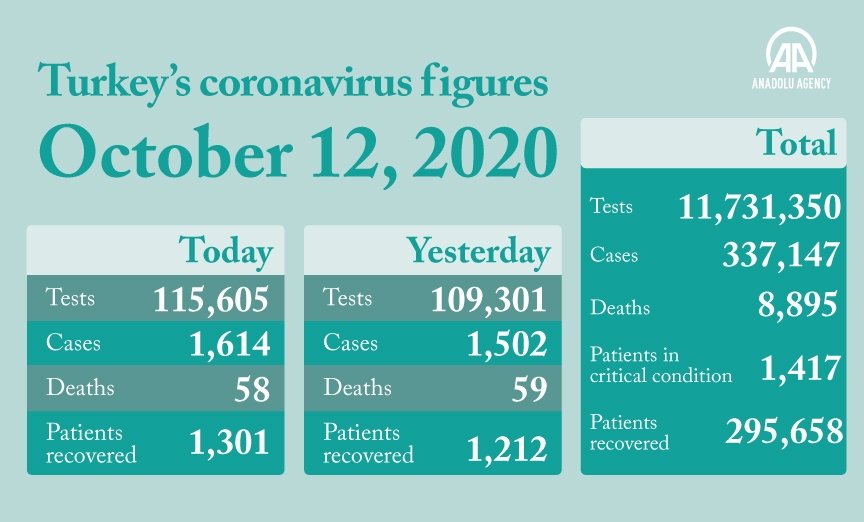 Turkey's patient count to date now stands at 337,147, with recoveries totaling 295,658, according to ministry data.