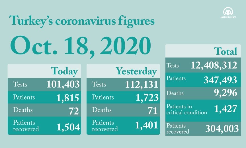 Turkey registered 1,815 new coronavirus patients in the last 24 hours, according to Health Ministry data released on Sunday.