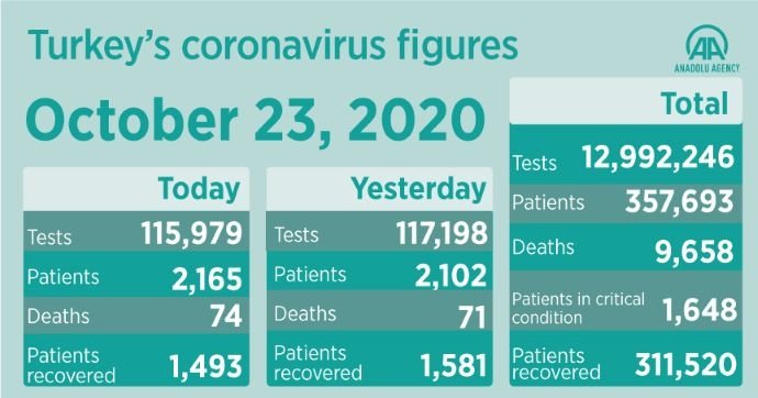 Turkey confirmed 2,165 more COVID-19 patients over the past 24 hours, authorities announced on Friday, the third day in a row new patient numbers have topped 2,000.