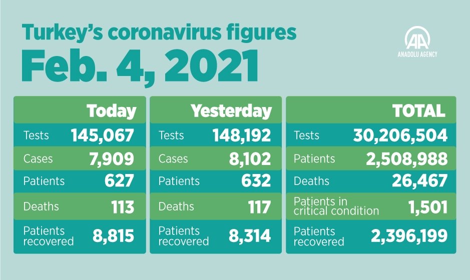 Turkey on Thursday reported 7,909 new coronavirus cases, including 627 symptomatic patients, according to data released by the Health Ministry.