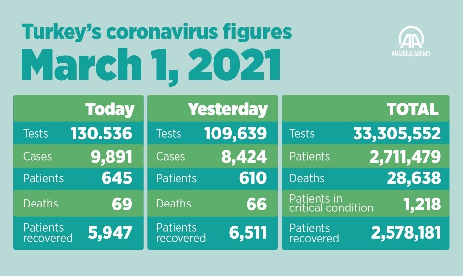 Turkey on Monday reported 9,891 new coronavirus cases, including 645 symptomatic patients.