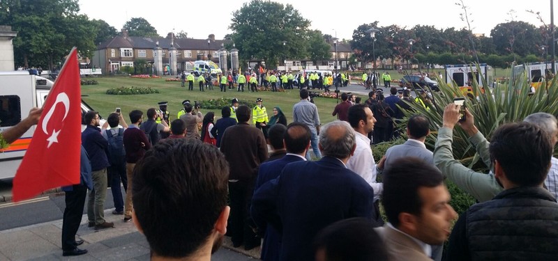 British police did not intervene to the attackers gathered in front of the building where the event was held, drawing a reaction from the Turkish citizens. A group later started to throw objects such as stones and water bottles at the building and injured a police officer.