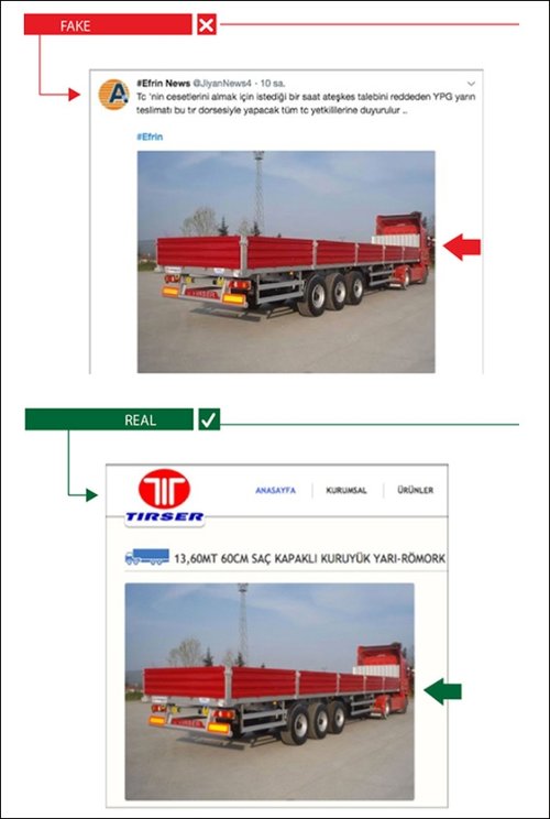 Another truck picture shared on social media claimed "The YPG killed lots of Turkish soldiers and their bodies will be delivered with truck trailer"; however, the picture is from a truck company's website.