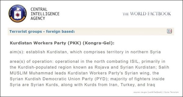 Under its "The World Factbook" section and Syria subcategory, the agency listed the Syria-based PYD as a PKK branch under foreign-based terrorist groups.