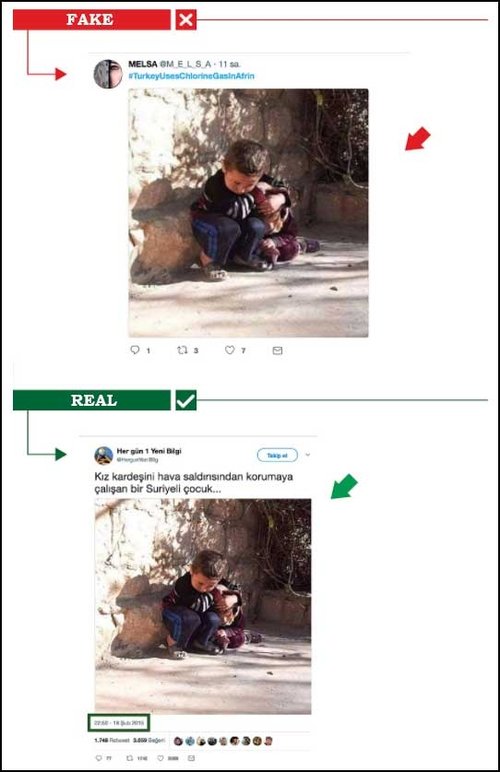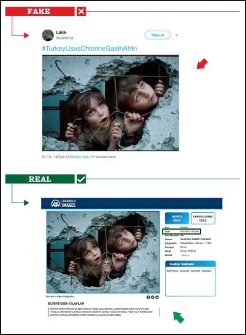The terrorist sympathizers were using images of children injured years ago at different places in Syria as if they had been harmed during the ongoing Operation Olive Branch in Afrin. Such fake pictures are then circulated on social media to smear Turkey's Afrin operation.