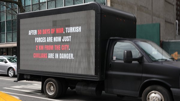 On the ad truck, a collage asserts: "On the 50th day of the war, Turkish forces are two kilometers away from the city. The civilians are in danger."