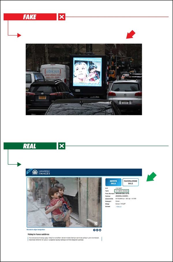 But the billboard shows two photos taken by Anadolu Agency in Aleppo, one-on the right-showing two brothers running from a Russian airstrike in July, 2016, the other-on the left-showing an injured child running from a Russian airstrike in October 2016.