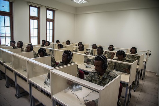 In one of the classes, around 20 Somali troops sit in separate booths with their headsets on. They listen to a track that the lecturer plays. It is actually a conversation in Turkish. The troops are taught Turkish throughout their training program at the base. Most Somali troops grasp and speak the language well enough toward the end of the program.