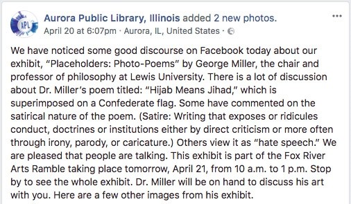 The poem, written by Professor George Miller, chair of the philosophy department at Lewis University, says "Hijab to me means jihad, so keep that s*** out of the country I love," in addition to several other lines disrespecting Islam.