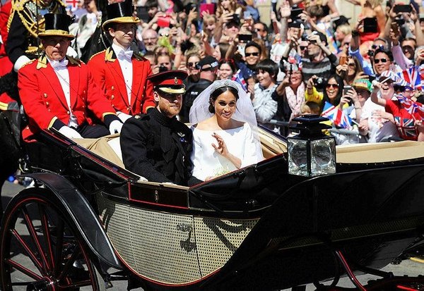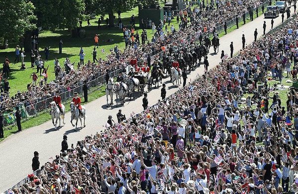 Up to 100,000 people, many decked out in patriotic paraphernalia, packed the streets of Windsor to get a glimpse of the newlyweds on their open-top carriage tour through the town afterwards.