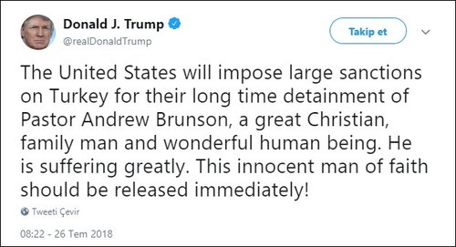 The Brunson case has been a thorny issue between Washington and Ankara. Washington has called on Ankara to release him, ignoring the fact that the judiciary is independent from the political administration. In a tweet after last week's hearing, Trumpclaimed Brunson has been "held hostage" and urged Erdoğan "do something to free this wonderful Christian husband and father."