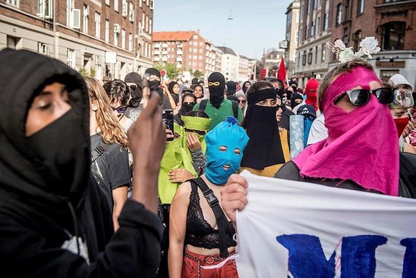 Demonstrators, who gathered in Nørrebro district of the capital city, covered their faces with veils and masks in support of women being targeted by the ban.