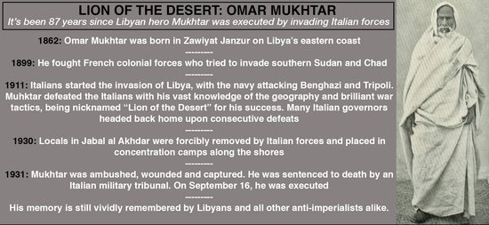 Mukhtar was killed 87 years ago — on Sept. 16, 2931 — by Italian occupiers, but he remains a symbol of resistance against impossible odds for successive generations of Libyan youth.