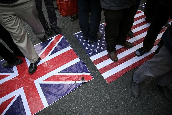 * Representations of the U.S. and British flags are walked on by demonstrators during an annual rally in front of the former U.S. Embassy in Tehran, Iran, on Sunday, Nov. 4, 2018, to mark the 39th anniversary of the seizure of the embassy by militant Iranian students. (AP)