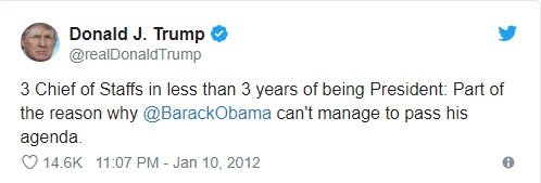On Jan. 10, 2012, Trump tweeted: "3 Chief of Staffs in less than 3 years of being President: Part of the reason why @BarackObama can't manage to pass his agenda."