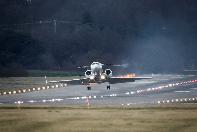 The government plane, which had been hidden away from view in a hangar, taxied onto the runway at Geneva airport as a rainbow came into view.