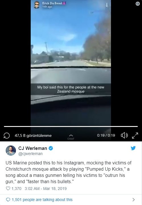 One U.S. Marine, identified by Twitter users as Erik Rijos, posted a video on his Instagram story following the attack playing Foster the People's song "Pumped Up Kicks," in which a gunman tells his victims to run "faster than my bullet" and "outrun my gun."