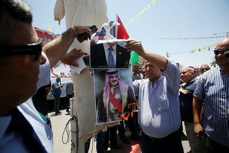 Thousands across the West Bank held up signs saying "Down with the Bahrain conference!" and "Do not sell the Palestinian cause and erase our identity."
