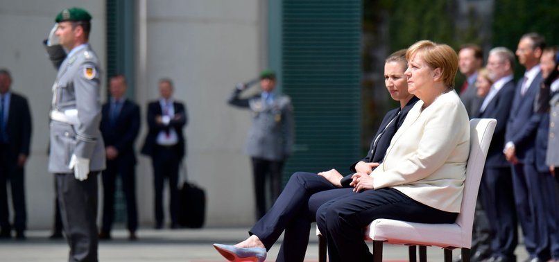 German Chancellor Angela Merkel and the visiting Danish prime minister sat through their countries' national anthems at a ceremony in Berlin Thursday, a day after Merkel shook as she stood at a similar event in the latest of three incidents that have raised concern about her health.