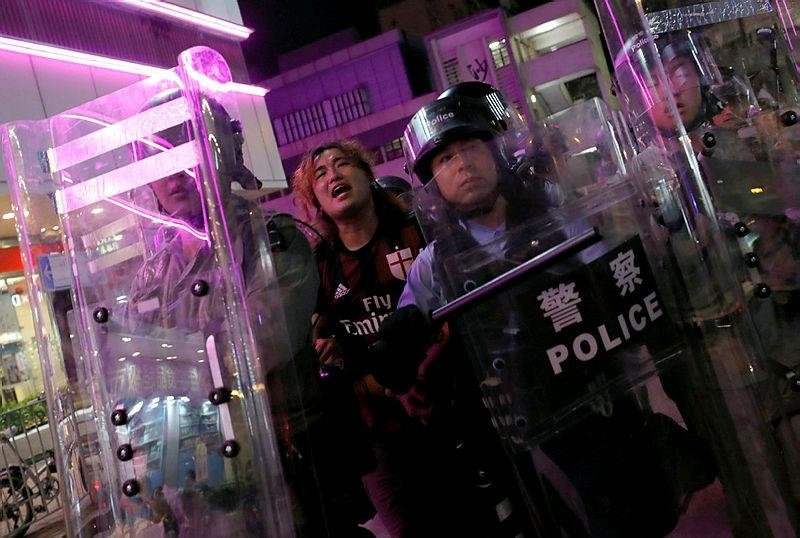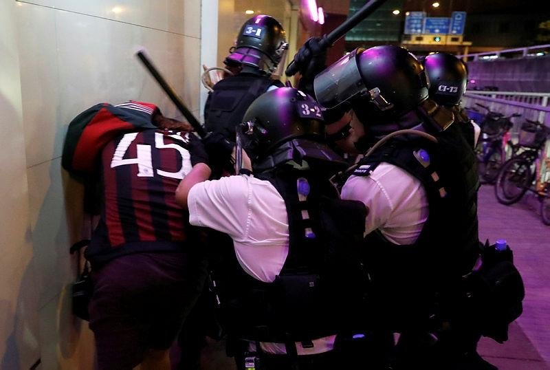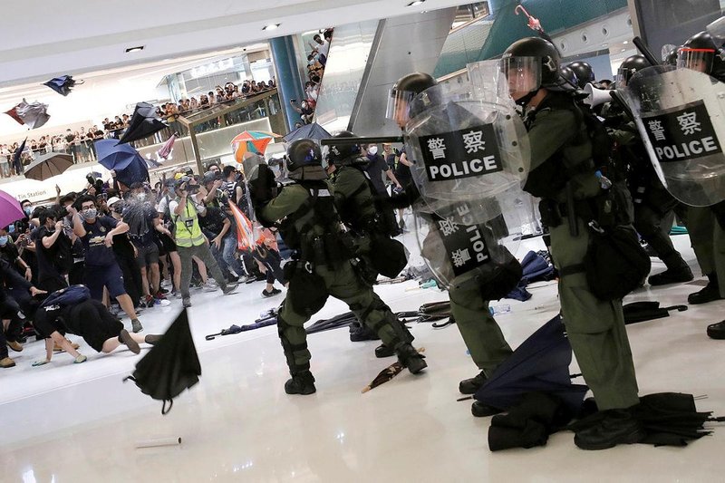 Hundreds of protesters, many wearing helmets and surgical masks, retreated into a shopping complex, where some threw umbrellas and water bottles at police. Police followed them, and reporters could see the two sides along walkways of several floors of the complex hitting each other with umbrellas and grabbing each other's helmets.