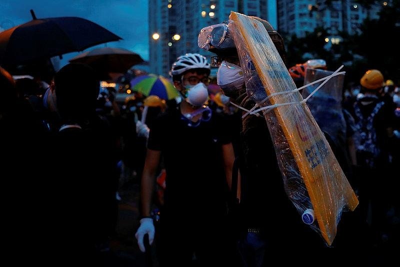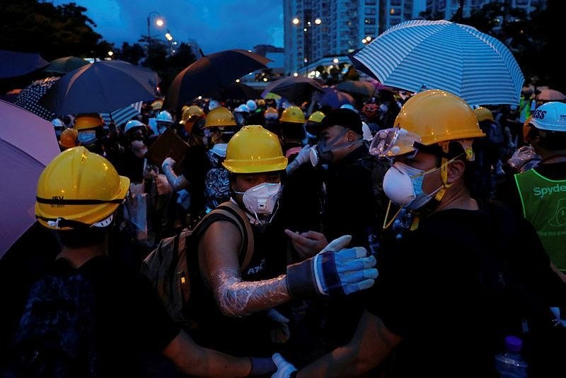 On Sunday, protesters demanded an investigation into complaints that police assaulted participants in earlier demonstrations against the extradition law. Some carried signs reading "Police Are Liars." Other signs read "Defend Hong Kong."