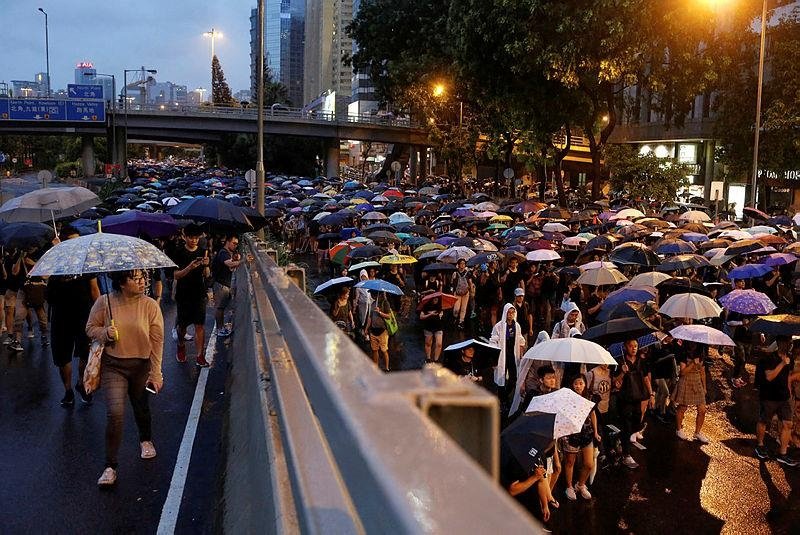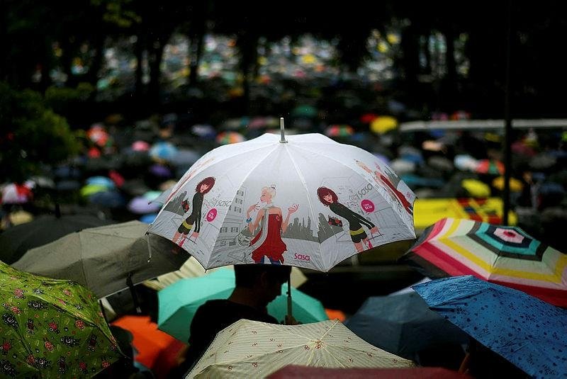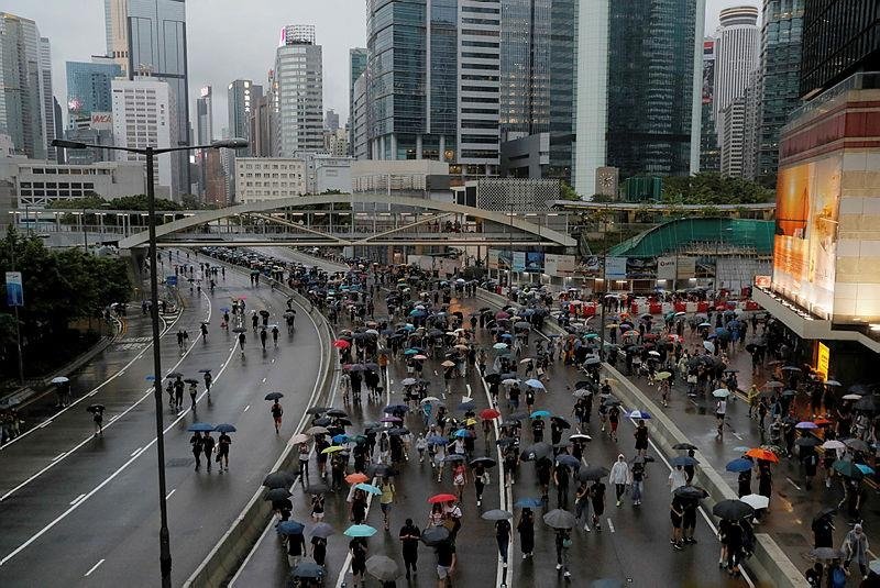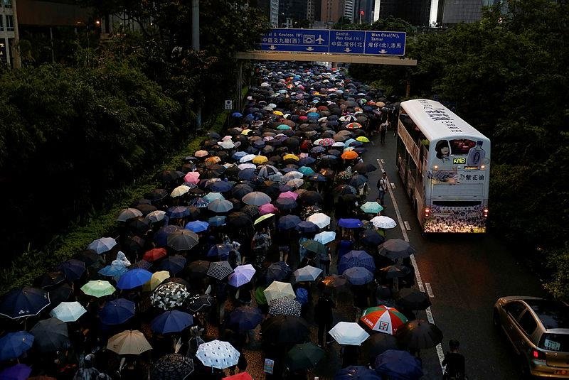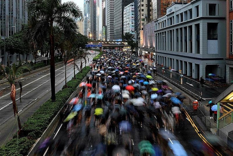 Hong Kong streets were turned into rivers of umbrellas on Sunday as hundreds of thousands of people marched through heavy rain down a major road in the Chinese territory, where massive pro-democracy demonstrations have become a regular weekend activity. Organizers said at least 1.7 million participated.