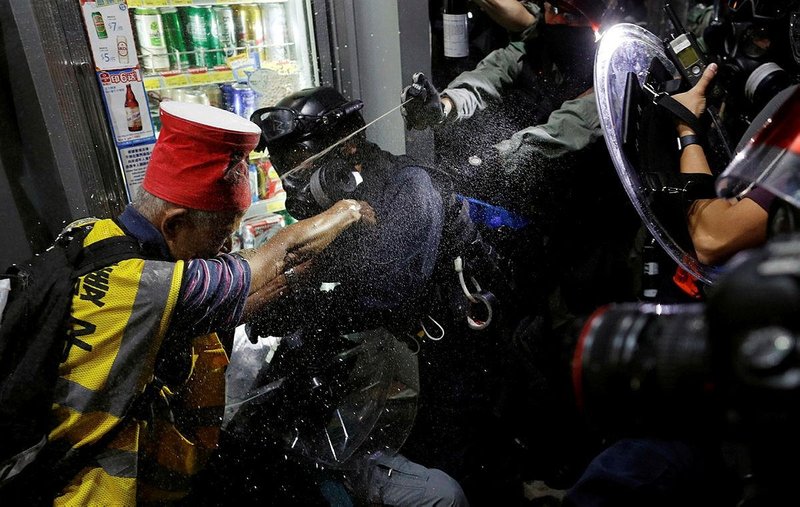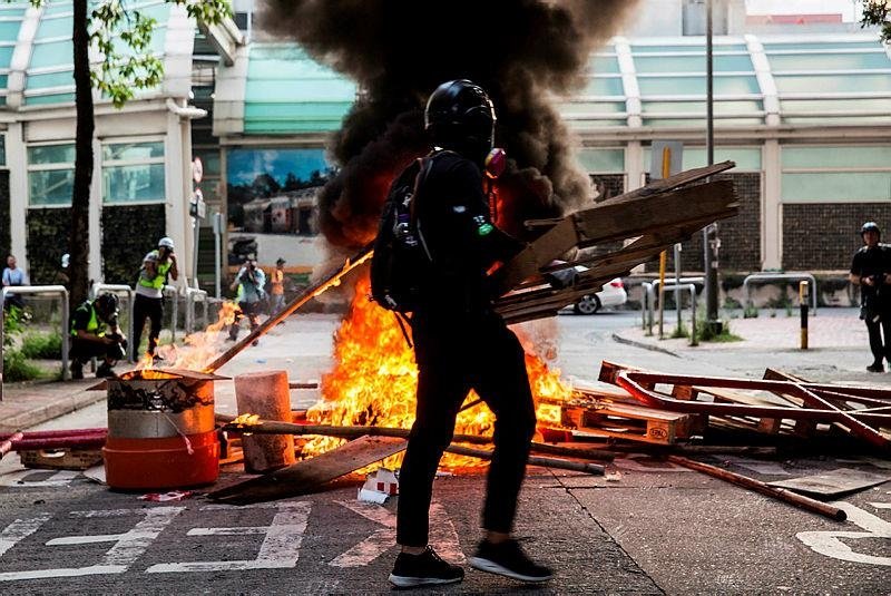 Most protesters in Tuen Mun were peaceful but some threw gasoline bombs and bricks toward police who faced them down the street. They appeared to fall short of the police and there was no indication anyone was hit.