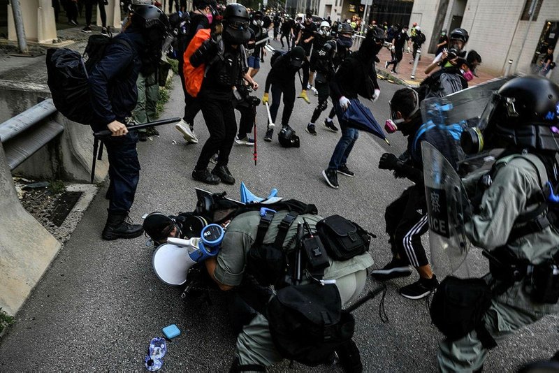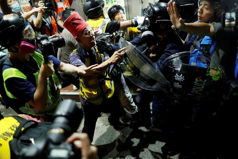 Near the subway station in the Tsuen Wan neighborhood, a woman who was tearing down posters threw a bag at a reporter and a man shoved a cameraman, RTHK reported. It said there was pushing and shoving between the two sides at stations in Yuen Long and Lok Fu.