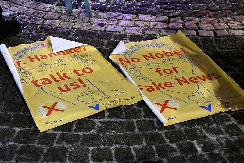 As dignitaries arrived in limousines, about a dozen protesters waved placards with slogans such as "No Nobel for Fake News", a reference to comments by Handke questioning the massacre of more than 8,000 Bosnian Muslim men and boys in Srebrenica in 1995.