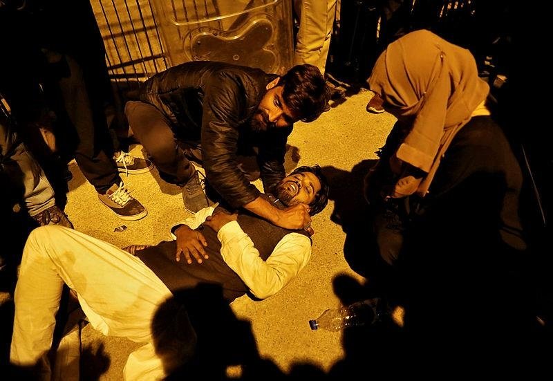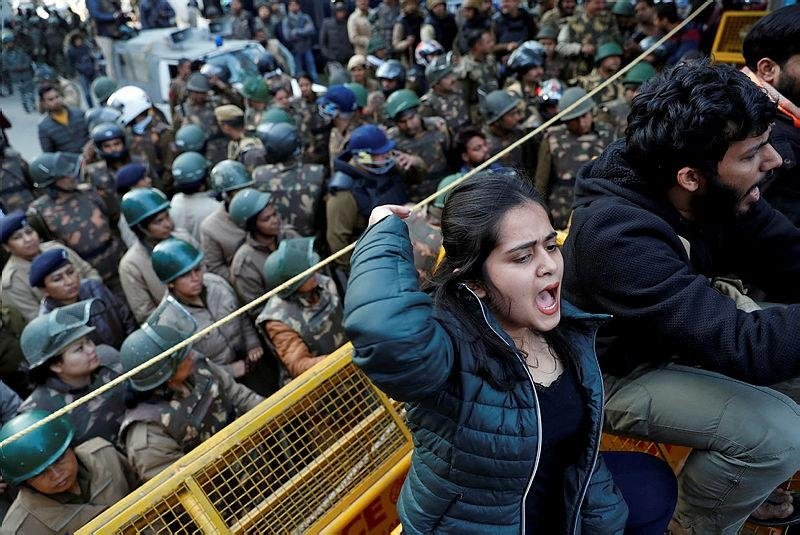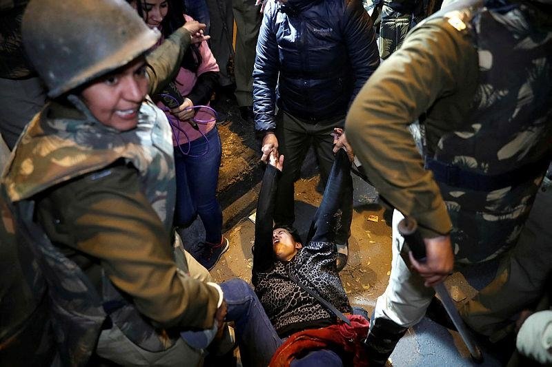Protests of the law in Delhi began at the mainly Muslim Jamia Millia Islamia University, where after a bus was set on fire police pursued protesters, shooting teargas canisters into the campus library and beating students with batons.