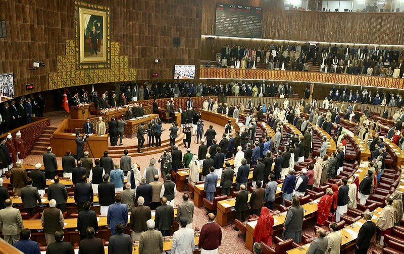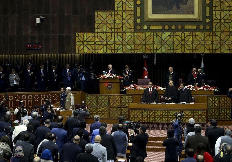 Prime Minister Imran Khan, Foreign Minister Shah Mehmood Qureshi, key opposition leader Bilawal Bhutto Zardari, and other senior Cabinet members, stood up on their first row seats, as Recep Tayyip Erdoğan entered the parliament.