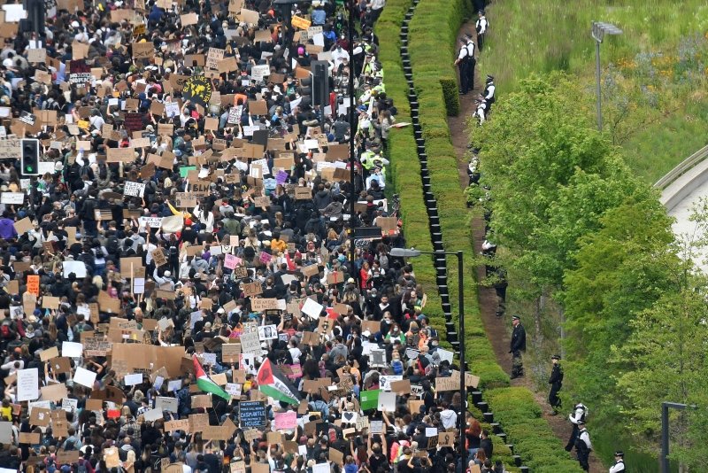 Thousands of protesters gathered outside the U.S. Embassy in London on Sunday to condemn police brutality after the killing of George Floyd in Minneapolis, some wearing face masks to protect against COVID-19 bearing the slogan "racism is a virus".