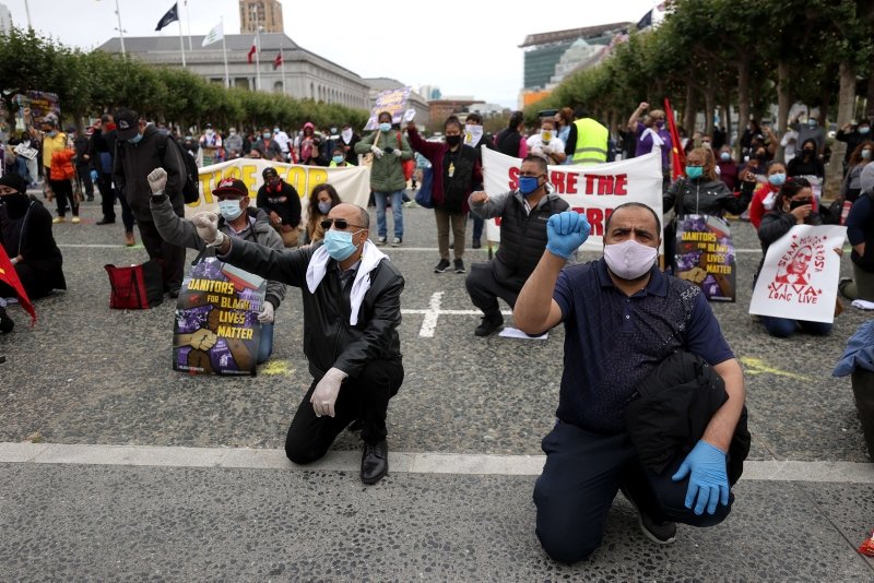 Where work stoppages were not possible for a full day, participants picketed during a lunch break or dropped to a knee in memory of police brutality victims, including George Floyd, a Black man killed in Minneapolis police custody in late May.