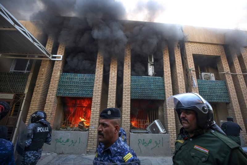 Hundreds of Hashed demonstrators swept past a security detail and stormed into the offices of the Kurdistan Democratic Party (KDP), which runs the Kurdish autonomous region in northern Iraq, and torched them.