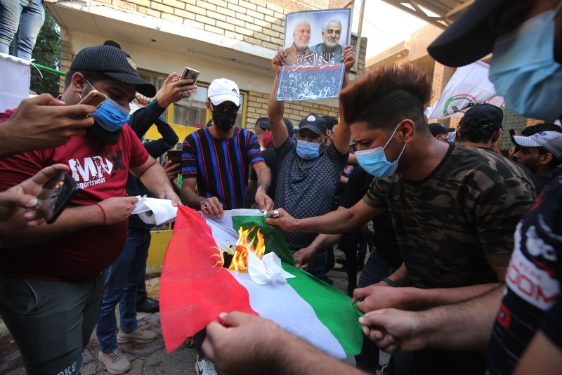 Protesters burned Kurdish flags while others carried posters of Iranian general Qasem Soleimani and his Iraqi lieutenant Abu Mahdi al-Muhandis, who were killed in a US drone strike in Baghdad last January.