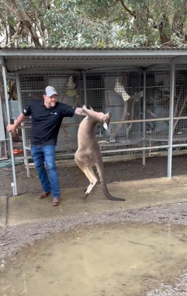 At one point, both men managed to hold one of the kangaroo's front paws, prompting it to rear up on its muscular tail and deliver swift kicks in a sensational display.